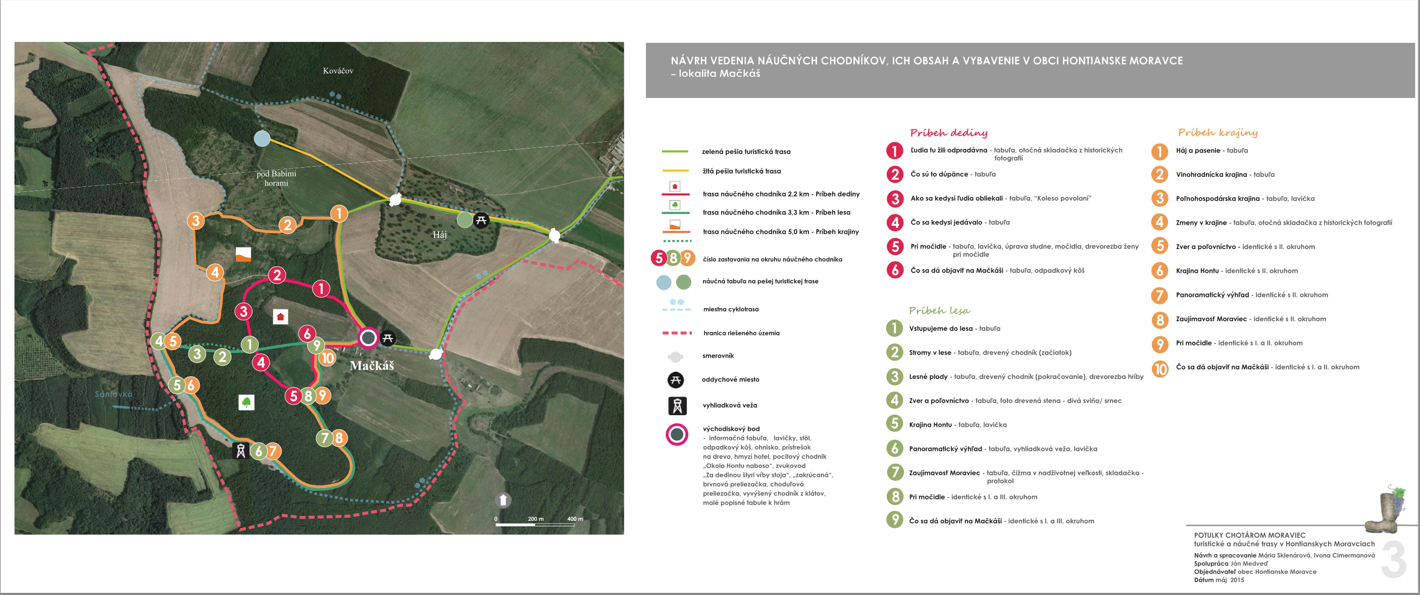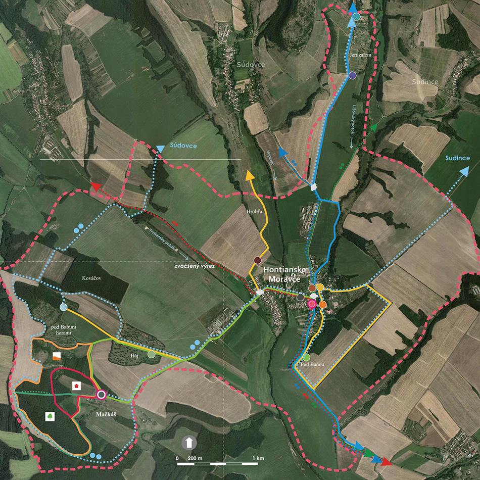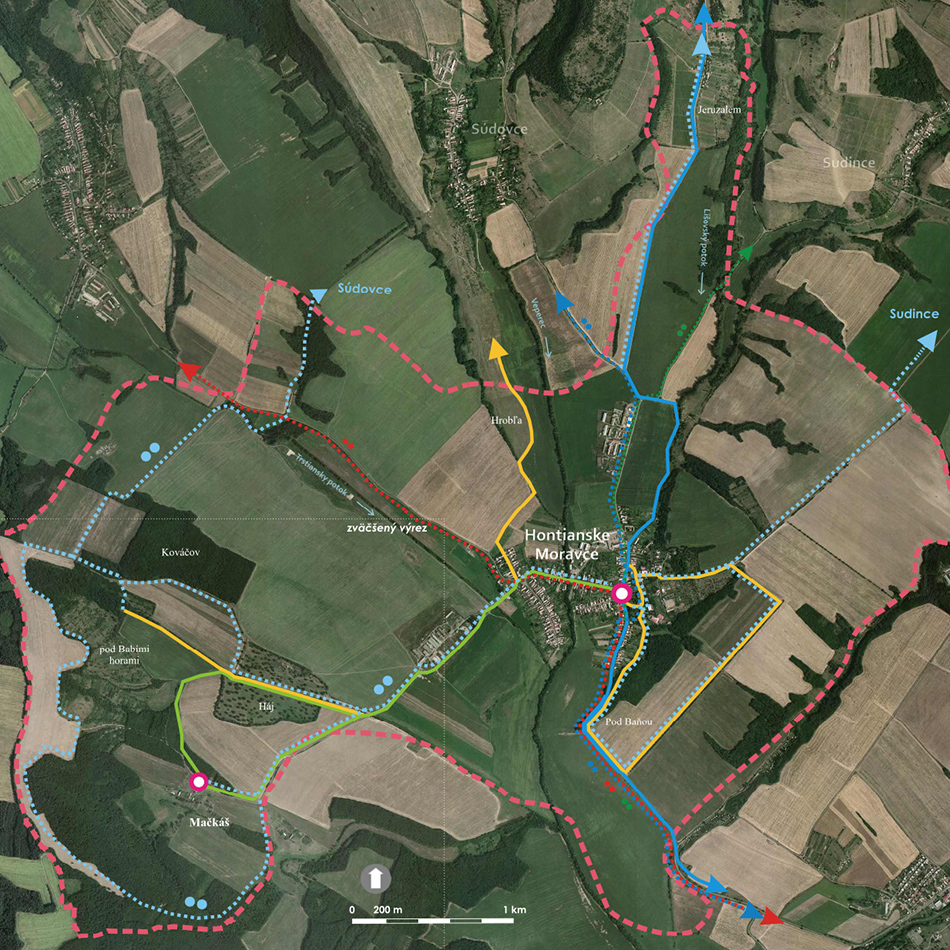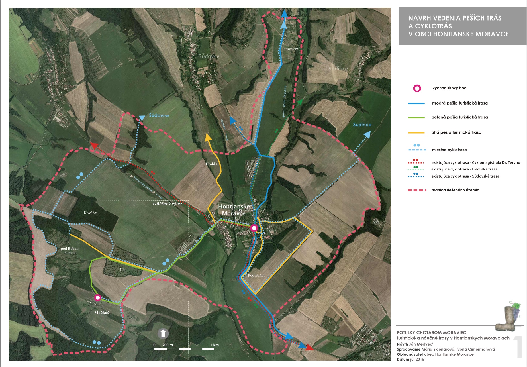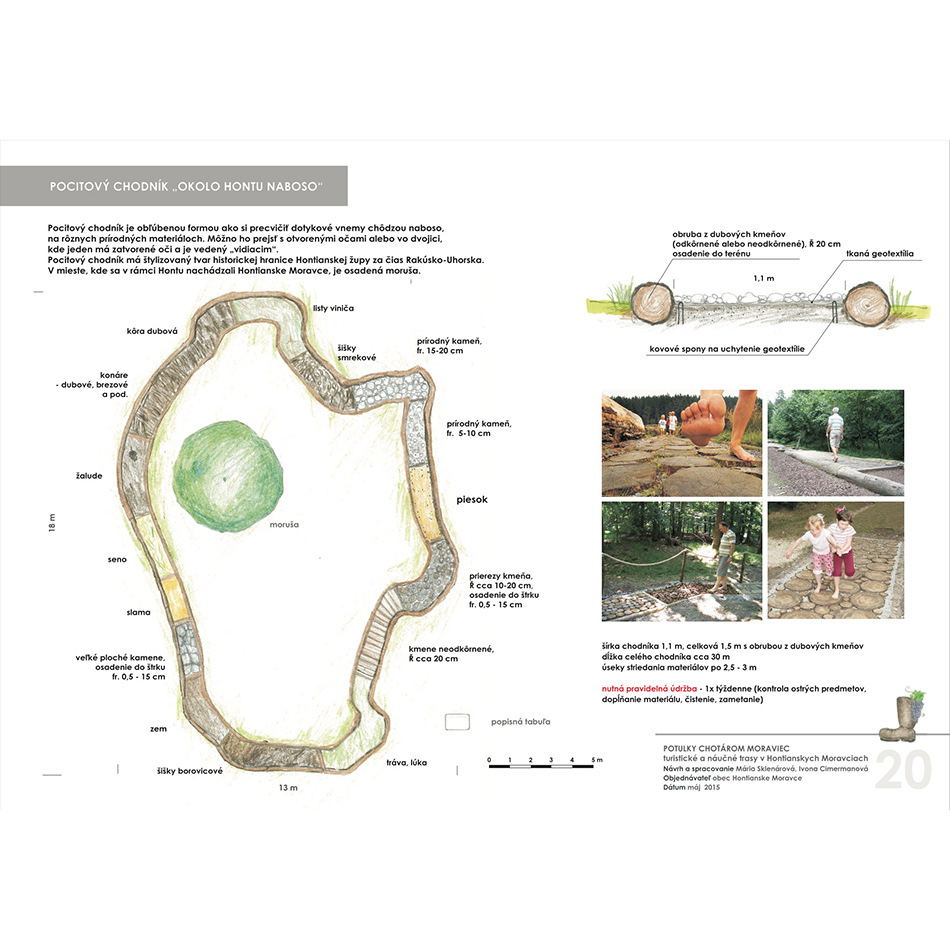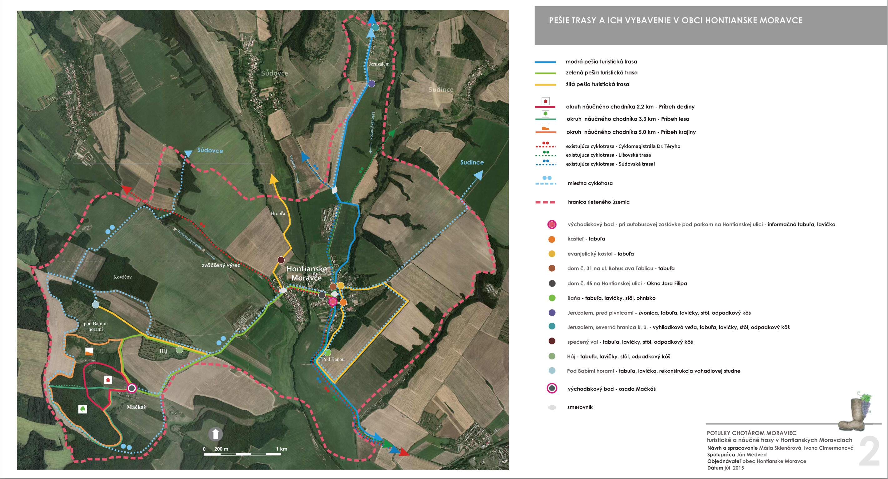 Blízkosť kúpeľného mesta Dudince, neexistujúce značené turistické trasy v samotnej obci a v okolitých obciach, potenciál prírodných, kultúrno-historických zaujímavostí a samotný záujem obce o vytvorenie náučného chodníka – boli hlavnými argumentmi pre vypracovanie štúdie návrhu chodníkov a peších trás s náučným charakterom v katastri obce Hontianske Moravce. V spolupráci s miestnym znalcom územia boli vypracované návrhy vedenia peších trás a náučných chodníkov – tak v obci ako aj v okolitej krajine. Výstupom projektu sú hotové návrhy informačných tabúľ v rôznych rozmeroch s textom aj grafickou úpravou, návrh nosičov informačných tabúľ, výtvarných prvkov a výber mobiliáru. Projekt zrozumiteľne podáva informácie o obci a jej okolí, v dvoch jazykových mutáciach. Dizajn prvkov má vidiecky charakter, s použitím prírodných materiálov. Hlavnými užívateľmi navrhovaného chodníka a peších trás budú kúpeľní hostia z Dudiniec, ale návrh predmetných trás bude zdrojom informácií aj pre domácich obyvateľov, pre žiakov zas môžu byť atraktívnym spestrením hodín regionálnej výchovy.