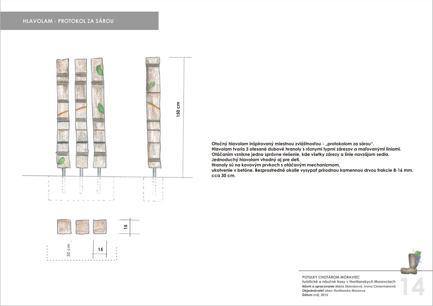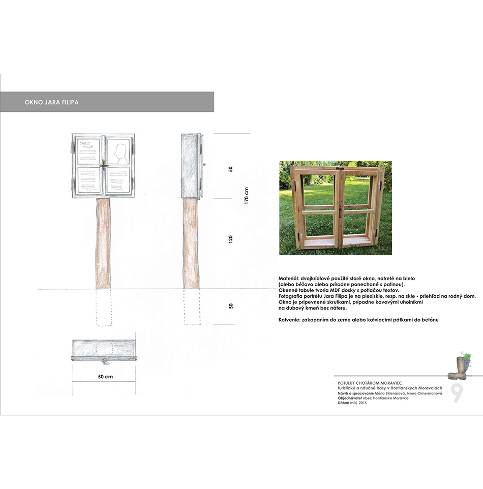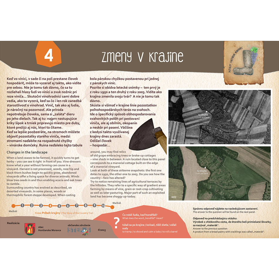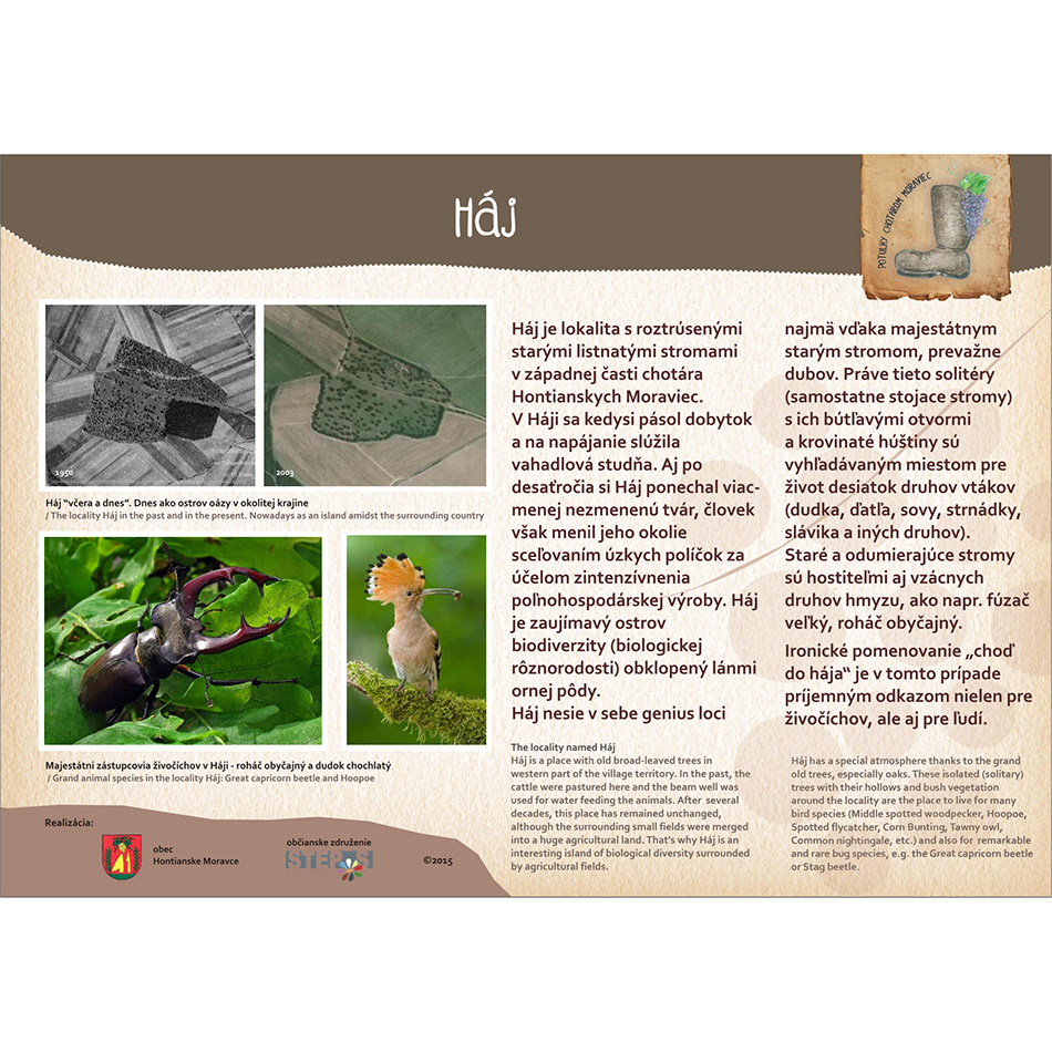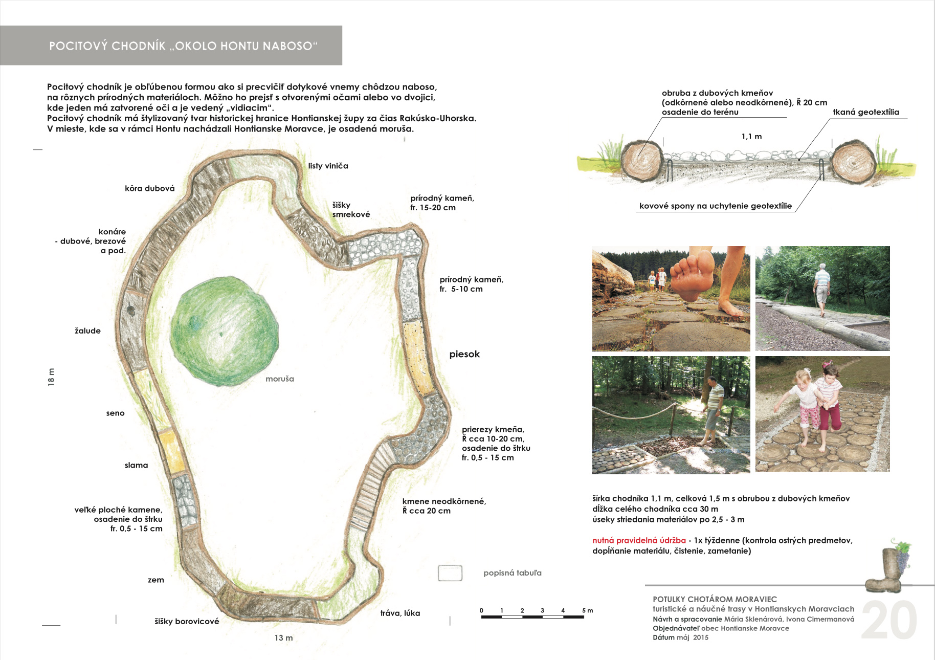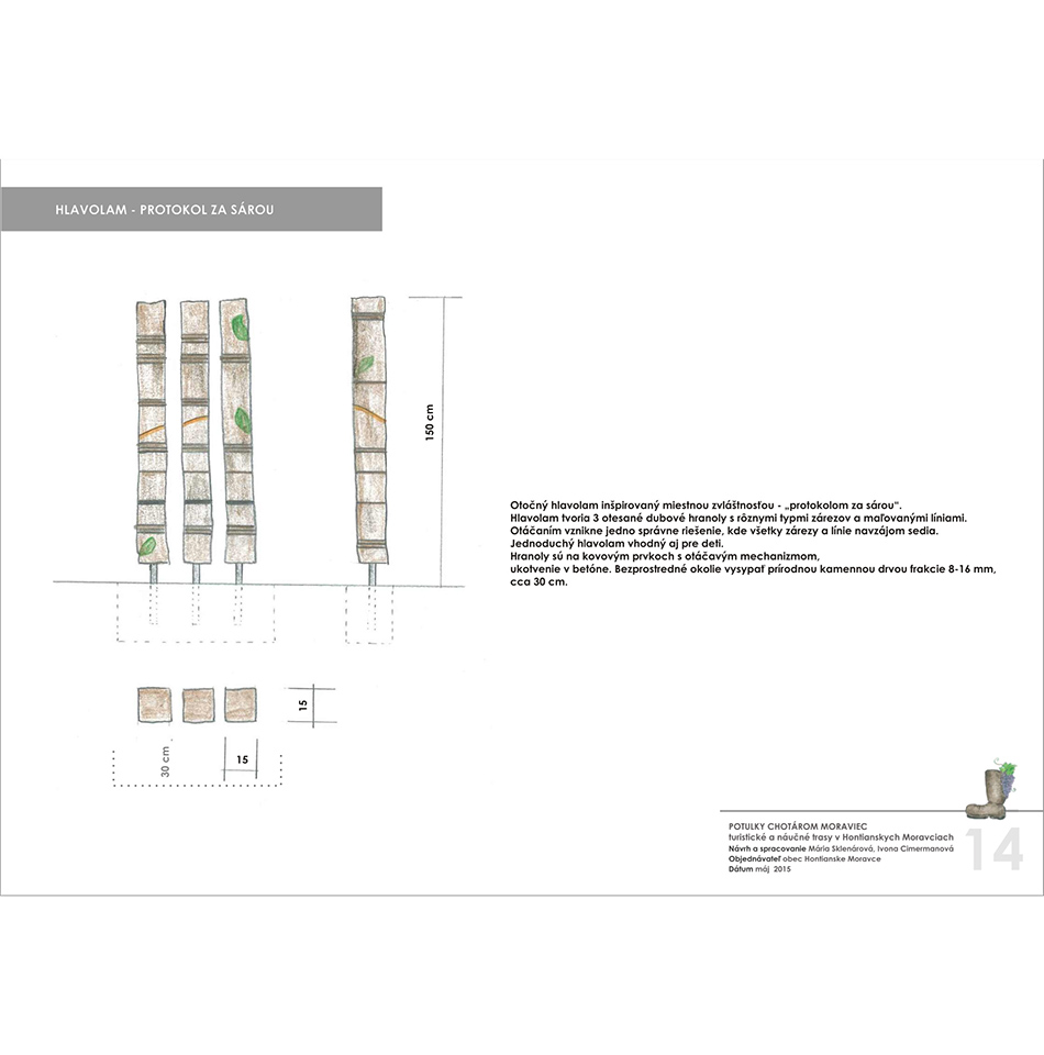 Blízkosť kúpeľného mesta Dudince, neexistujúce značené turistické trasy v samotnej obci a v okolitých obciach, potenciál prírodných, kultúrno-historických zaujímavostí a samotný záujem obce o vytvorenie náučného chodníka – boli hlavnými argumentmi pre vypracovanie štúdie návrhu chodníkov a peších trás s náučným charakterom v katastri obce Hontianske Moravce. V spolupráci s miestnym znalcom územia boli vypracované návrhy vedenia peších trás a náučných chodníkov – tak v obci ako aj v okolitej krajine. Výstupom projektu sú hotové návrhy informačných tabúľ v rôznych rozmeroch s textom aj grafickou úpravou, návrh nosičov informačných tabúľ, výtvarných prvkov a výber mobiliáru. Projekt zrozumiteľne podáva informácie o obci a jej okolí, v dvoch jazykových mutáciach. Dizajn prvkov má vidiecky charakter, s použitím prírodných materiálov. Hlavnými užívateľmi navrhovaného chodníka a peších trás budú kúpeľní hostia z Dudiniec, ale návrh predmetných trás bude zdrojom informácií aj pre domácich obyvateľov, pre žiakov zas môžu byť atraktívnym spestrením hodín regionálnej výchovy.