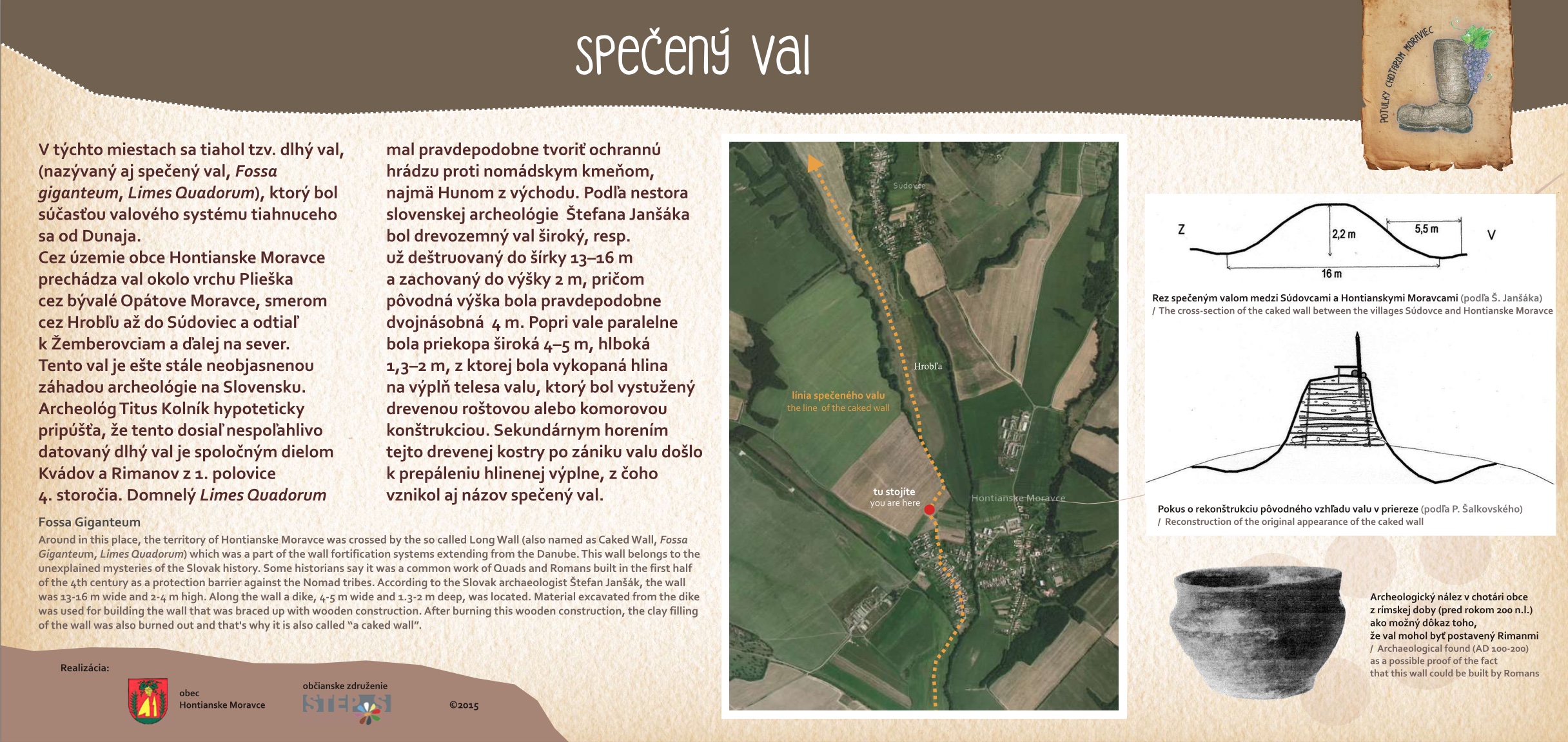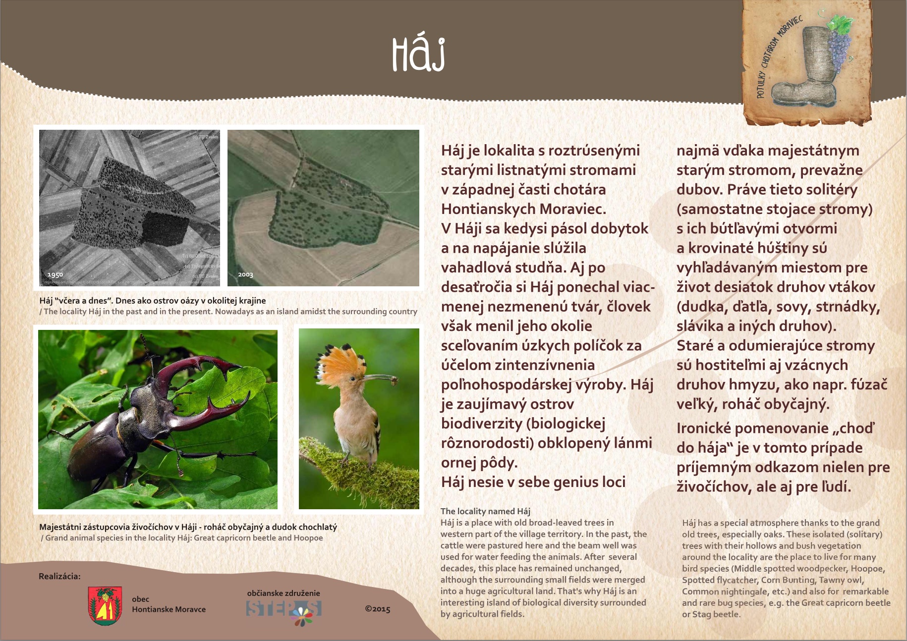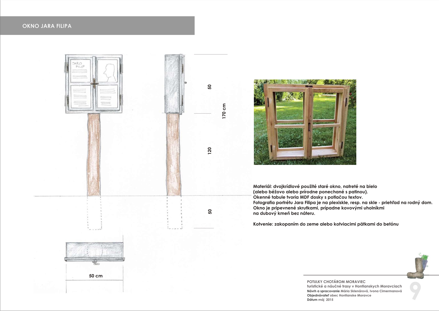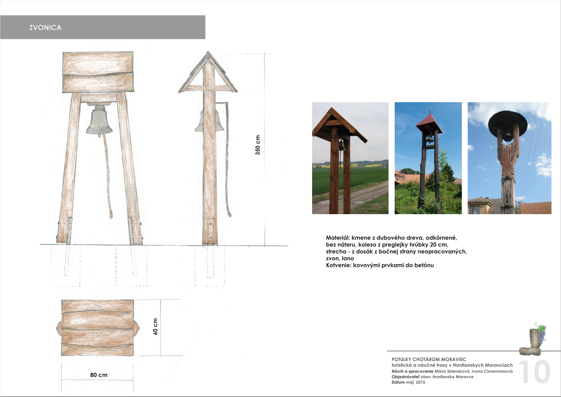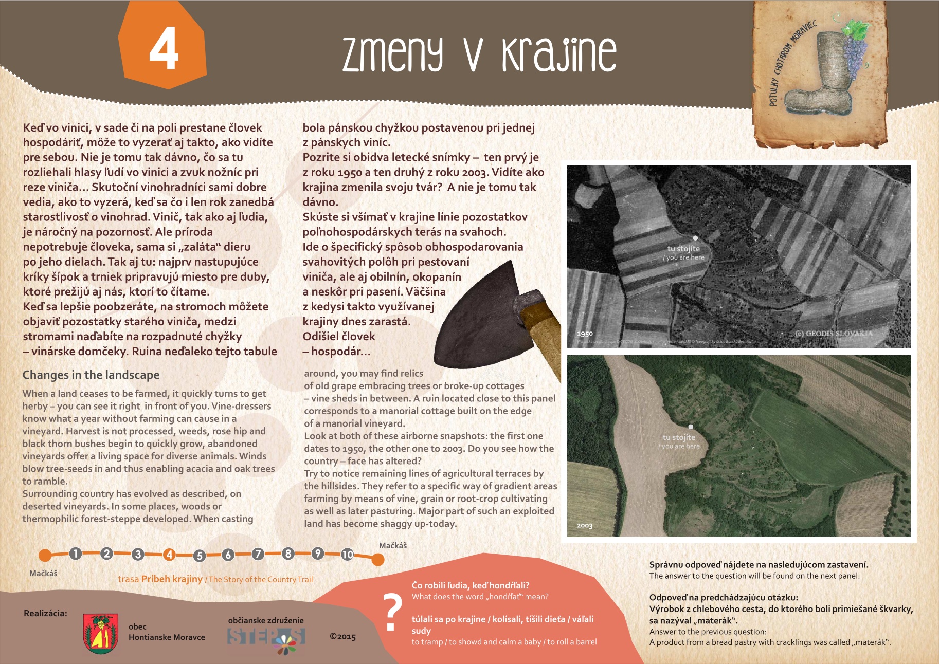 Blízkosť kúpeľného mesta Dudince, neexistujúce značené turistické trasy v samotnej obci a v okolitých obciach, potenciál prírodných, kultúrno-historických zaujímavostí a samotný záujem obce o vytvorenie náučného chodníka – boli hlavnými argumentmi pre vypracovanie štúdie návrhu chodníkov a peších trás s náučným charakterom v katastri obce Hontianske Moravce. V spolupráci s miestnym znalcom územia boli vypracované návrhy vedenia peších trás a náučných chodníkov – tak v obci ako aj v okolitej krajine. Výstupom projektu sú hotové návrhy informačných tabúľ v rôznych rozmeroch s textom aj grafickou úpravou, návrh nosičov informačných tabúľ, výtvarných prvkov a výber mobiliáru. Projekt zrozumiteľne podáva informácie o obci a jej okolí, v dvoch jazykových mutáciach. Dizajn prvkov má vidiecky charakter, s použitím prírodných materiálov. Hlavnými užívateľmi navrhovaného chodníka a peších trás budú kúpeľní hostia z Dudiniec, ale návrh predmetných trás bude zdrojom informácií aj pre domácich obyvateľov, pre žiakov zas môžu byť atraktívnym spestrením hodín regionálnej výchovy.