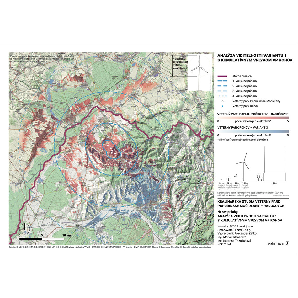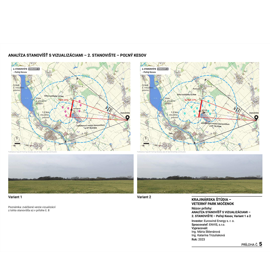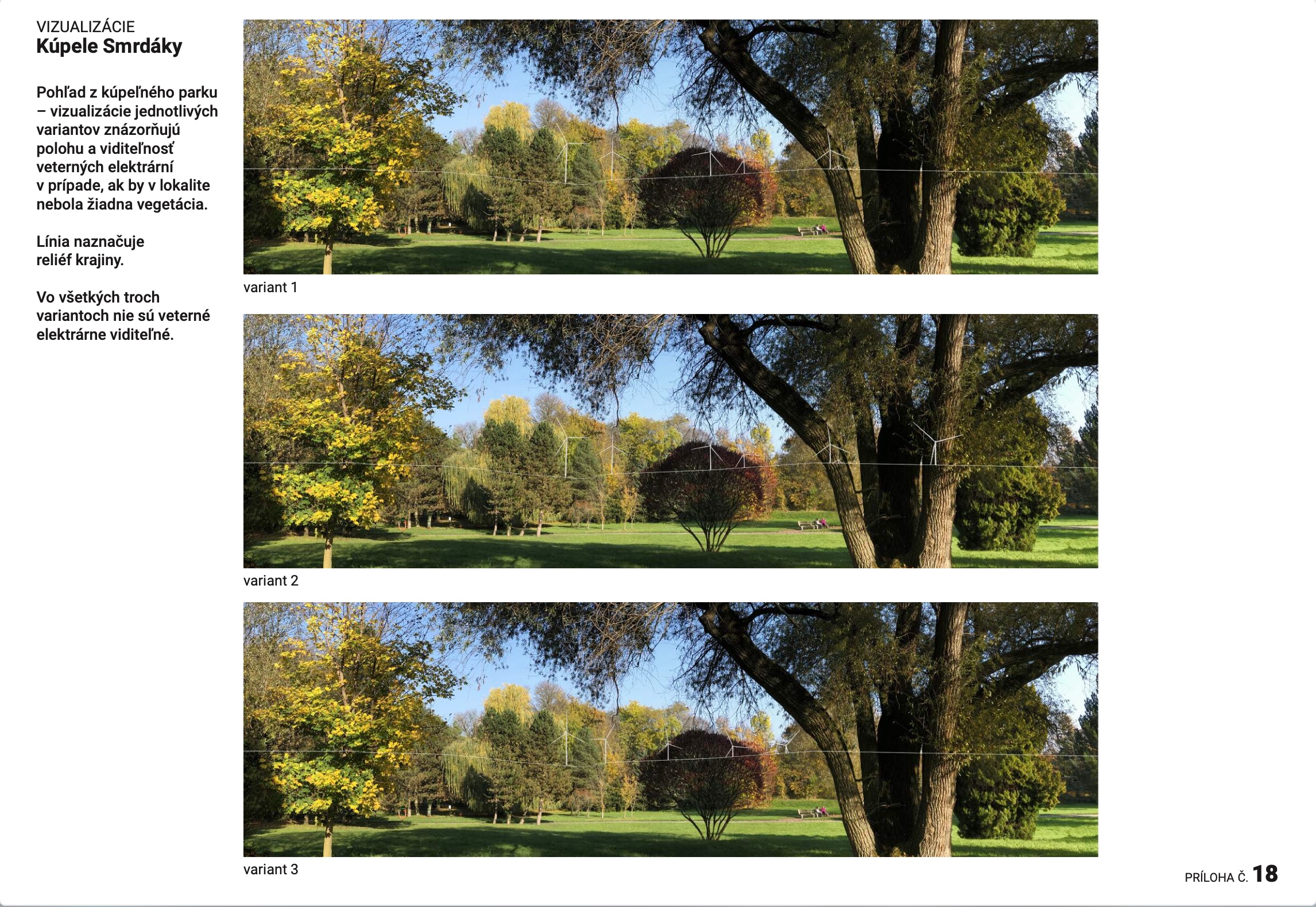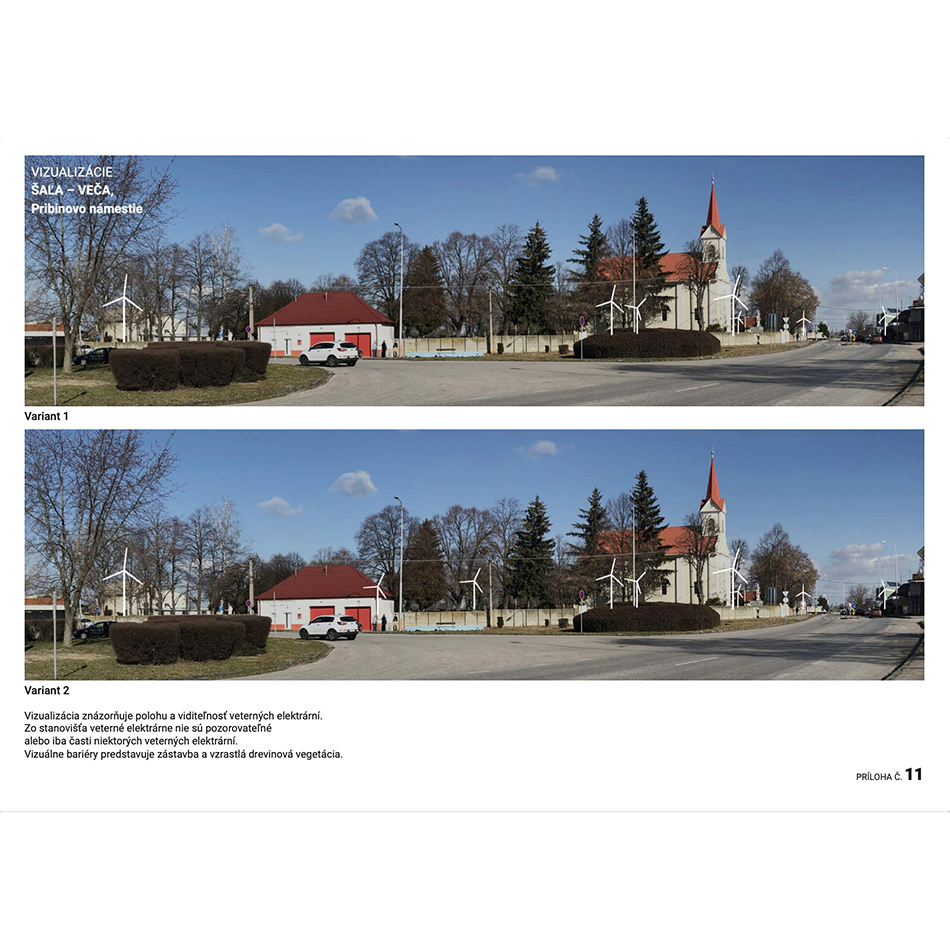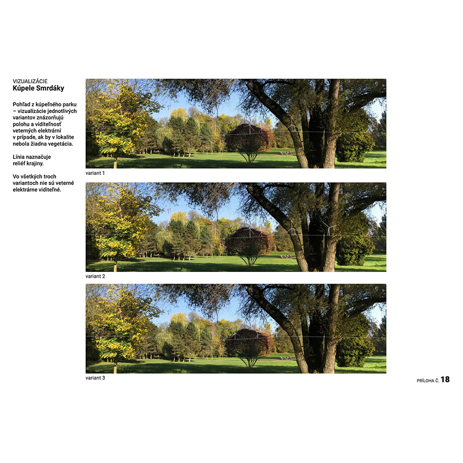 Vypracovali sme viacero krajinárskych štúdií veterných parkov v rámci procesu EIA. Keďže je predpoklad, že veterný park bude v krajine pôsobiť ako výrazná dominanta a tým zmení vizuálne vnímanie krajiny, vypracované štúdie skúmajú rozsah vizuálneho vplyvu. Na priblíženie zmien, ktoré v krajine nastanú je potrebné identifikovať hodnoty krajiny a určiť mieru ich ohrozenia. Okrem mapových výstupov znázorňujúcich plošný rozsah vizuálneho vplyvu, sú znázornené zmeny vzhľadu krajiny vo fotografiách súčasného stavu. Modelovanie a vizualizácia vizuálneho pôsobenia nových prvkov v krajine umožňuje pripraviť opatrenia na zmiernenie ich vplyvu.