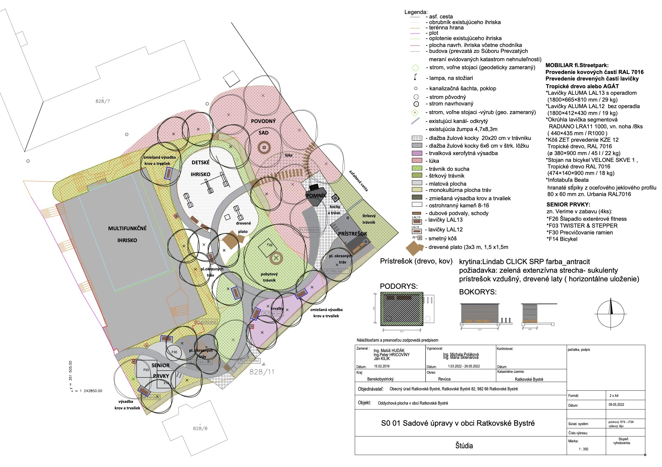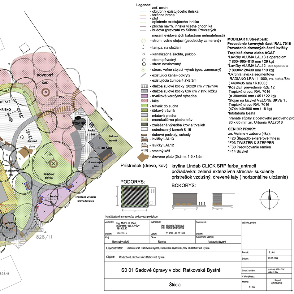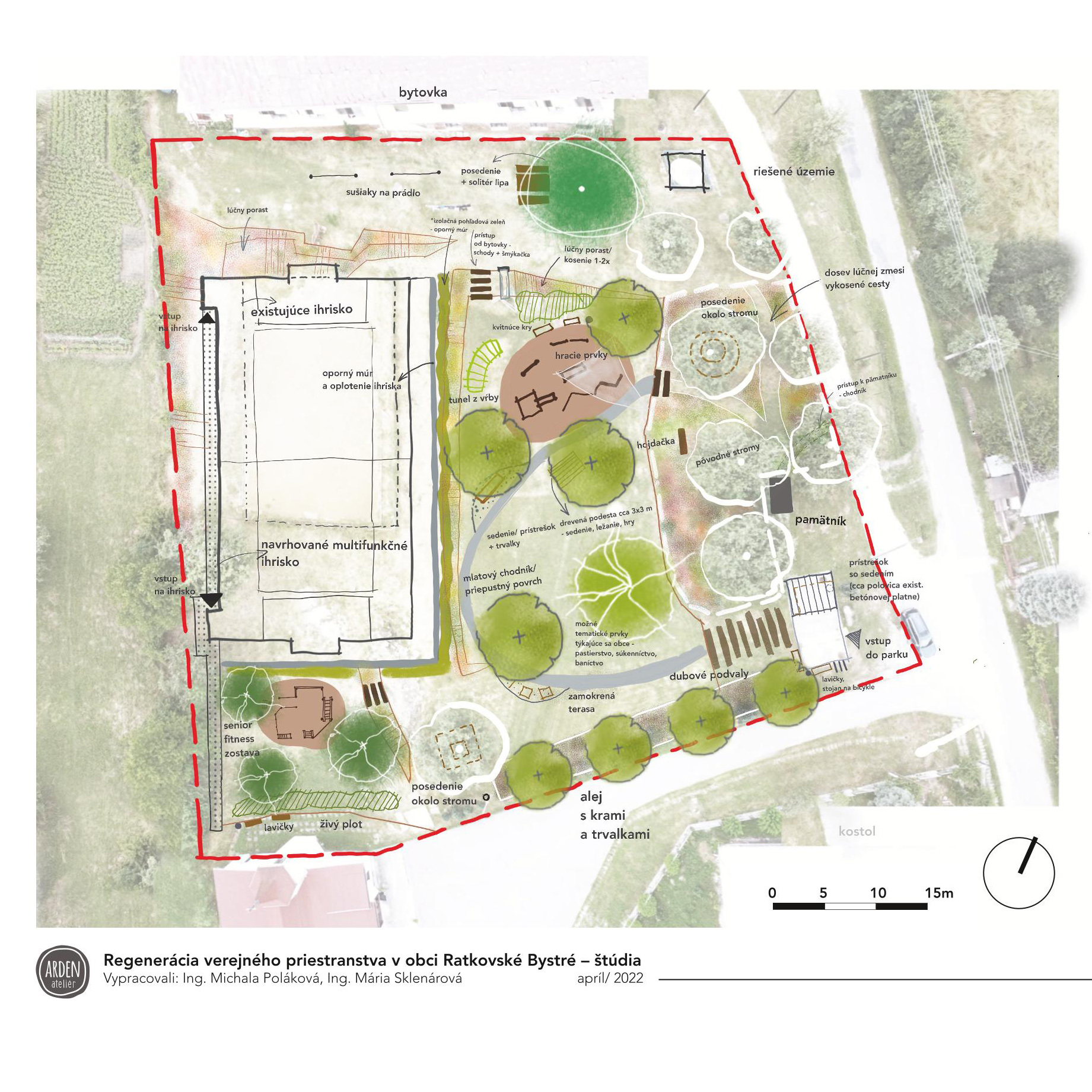Regenerácia verejného priestranstva v malej gemerskej obce Ratkovské Bystré v blízkosti Národného parku Muránska planina. Cieľom bolo vytvorenie funkčného oddychovo-rekreačného priestoru pre všetky vekové kategórie obyvateľov, pre krátkodobý oddych a stretávanie miestnych obyvateľov, aj návštevníkov obce. Hlavným zámerom štúdie bolo zatraktívniť a sfunkčniť hlavné verejné priestranstvo v obci, navrhnúť pešie komunikácie, vhodne umiestniť prvky pre seniorov, zrevitalizovať existujúcu vegetáciu (dreviny v ovocnom sade), doplniť o ďalšiu zeleň, navrhnúť trvalkové záhony, prístup k pamätníku a doplniť mobiliár. Súčasťou návrhu je vytvorenie prístrešku, ktorý by slúžil cykloturistom, turistom, miestnym obyvateľom. Prístrešok by bol zároveň informačným bodom o obci a jeho okolí.